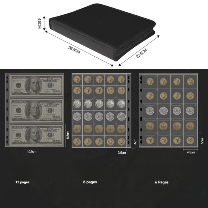 Vous disposez également de 8 pages pour 240 pièces de monnaie maximum (30 pochettes aux dimensions de 3.5×4cm par page) et 6 pages pour 120 pièces plus importantes (20 pochettes aux dimensions de 4.5×5cm par page).