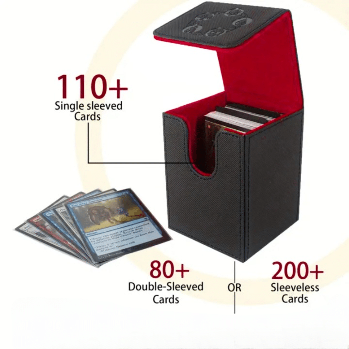 La fermeture est simple et fiable grâce au clapet magnétique : 4 paires d’aimants puissants assurent une fermeture sécurisée et évitent les ouvertures surprises pendant le trajet. Le cuir PU solide protège des petits chocs et des rayures, et la doublure intérieure en microfibre douce aide à préserver vos sleeves quand vous sortez et remettez le deck souvent. Vous gardez une boîte propre, agréable à manipuler, même après de nombreuses parties.