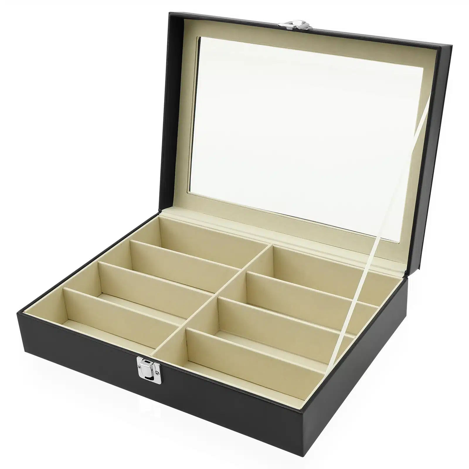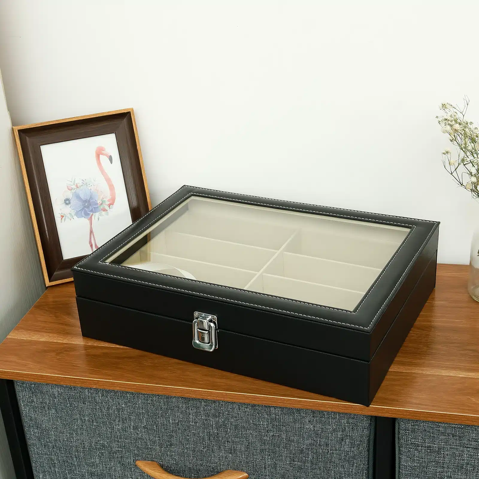 Le couvercle transparent en acrylique clair permet de voir immédiatement l’ensemble de la collection sans ouvrir la boîte. Vous retrouvez en un coup d’œil la paire que vous cherchez. Le tout est sécurisé par un loquet métallique solide qui maintient le couvercle bien fermé.