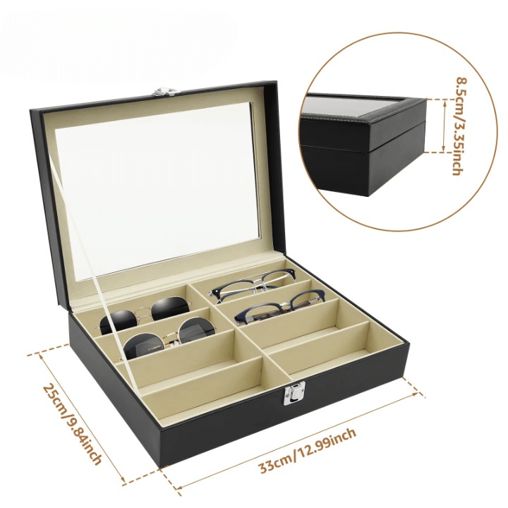 Ce coffret élégant en cuir PU noir offre une présentation nette et soignée pour 8 paires de lunettes, qu’il s’agisse de vos modèles du quotidien ou de pièces de collection.