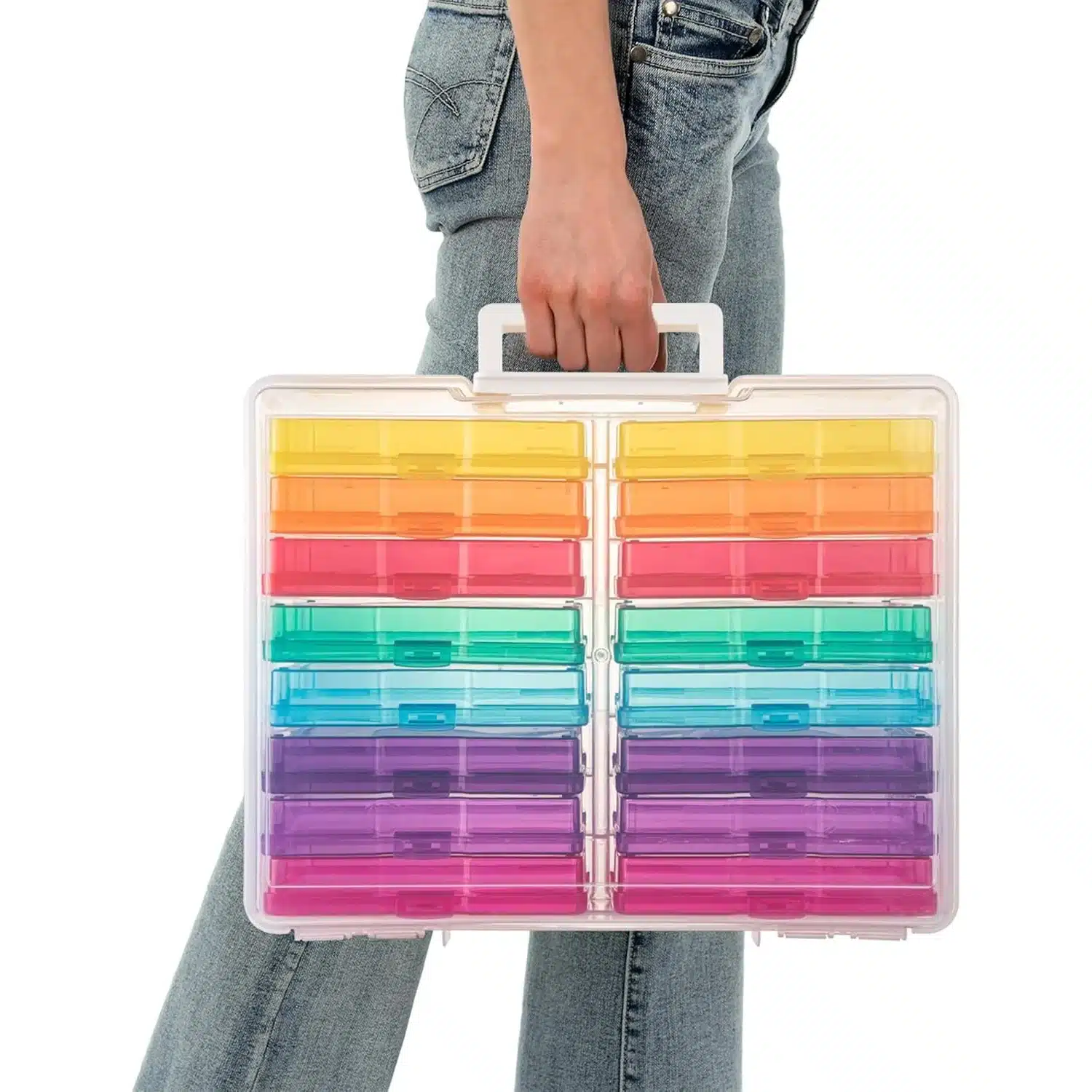 Malette de rangement avec poignée intégrant 16 boites colorées et une capacité maximale de 1600 photos format 10x15cm, cette boite rangement photo organise vos tirages dans un support compact et simple à transporter.
