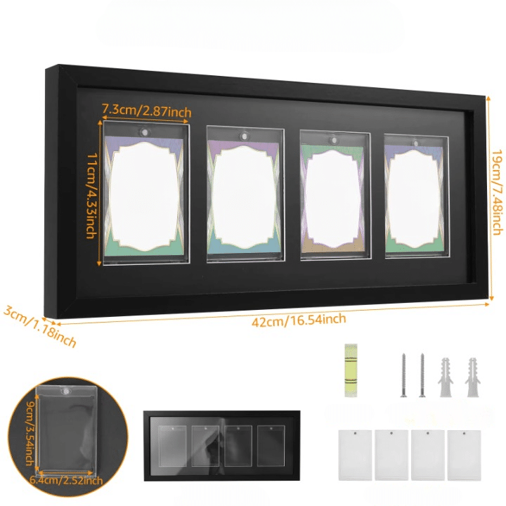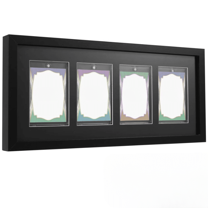 Ce cadre noir mural rectangulaire permet d’afficher 4 cartes à collectionner sous toploaders, dans un format horizontal élégant qui attire immédiatement le regard.