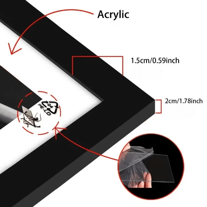 Le vitrage acrylique protège efficacement la photo contre la poussière et les manipulations du quotidien. Il est léger et résistant, ce qui facilite la mise en place du cadre. Un film de protection est présent sur le vitrage et doit être retiré avant l’utilisation pour profiter d’une transparence nette.