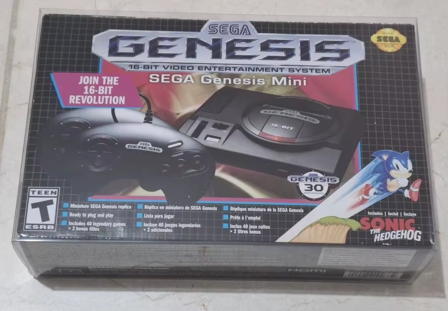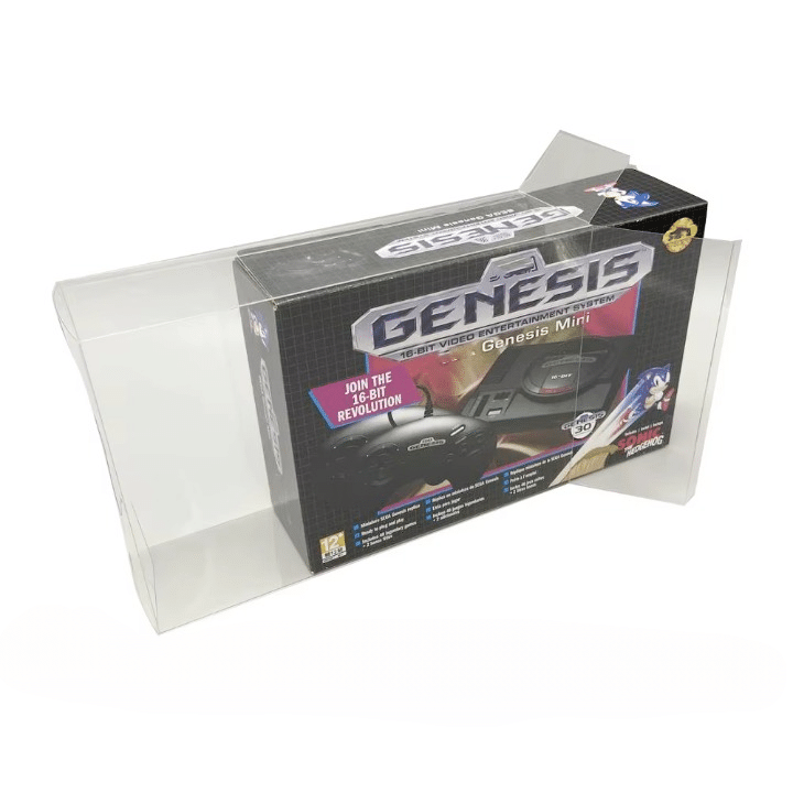 La case for sega genesis mini est livrée à plat pour un transport simple, puis se déplie en quelques secondes avant usage. Un film protecteur est présent sur la surface : il sert à préserver la transparence et la brillance pendant la manipulation, il suffit de le retirer au moment de l’exposition pour profiter d’un rendu propre.