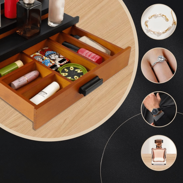 Chaque tablette accueille plusieurs bouteilles, les parfums restent visibles et à portée de main. Les dimensions compactes de 31.7×21×11.3cm offrent un vrai gain de place tout en gardant une belle présentation.