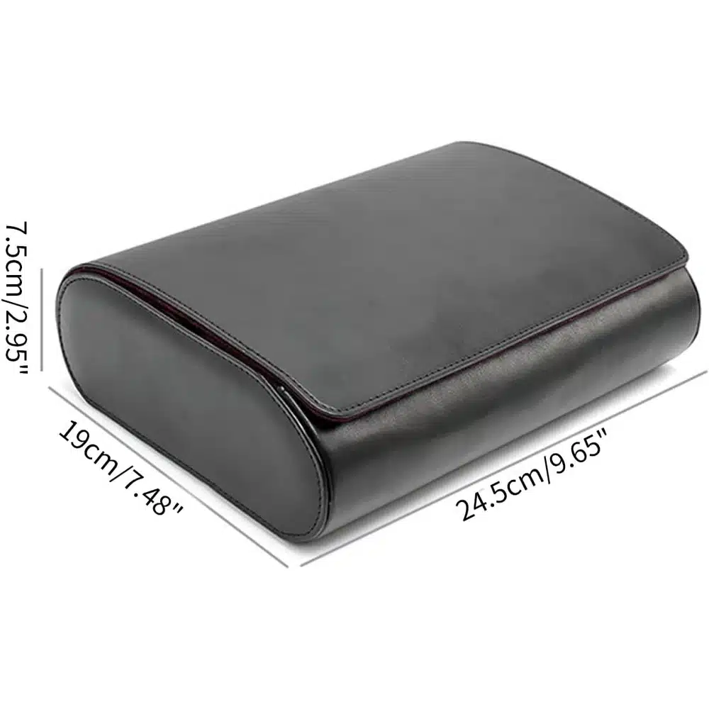 L’extérieur en cuir PU noir de belle finition donne un rendu soigné et résiste bien au quotidien ; l’intérieur en microfibre préserve boîtiers et bracelets. Quatre boutons-pressions ferment l’ensemble et assurent un maintien ferme pendant le transport.