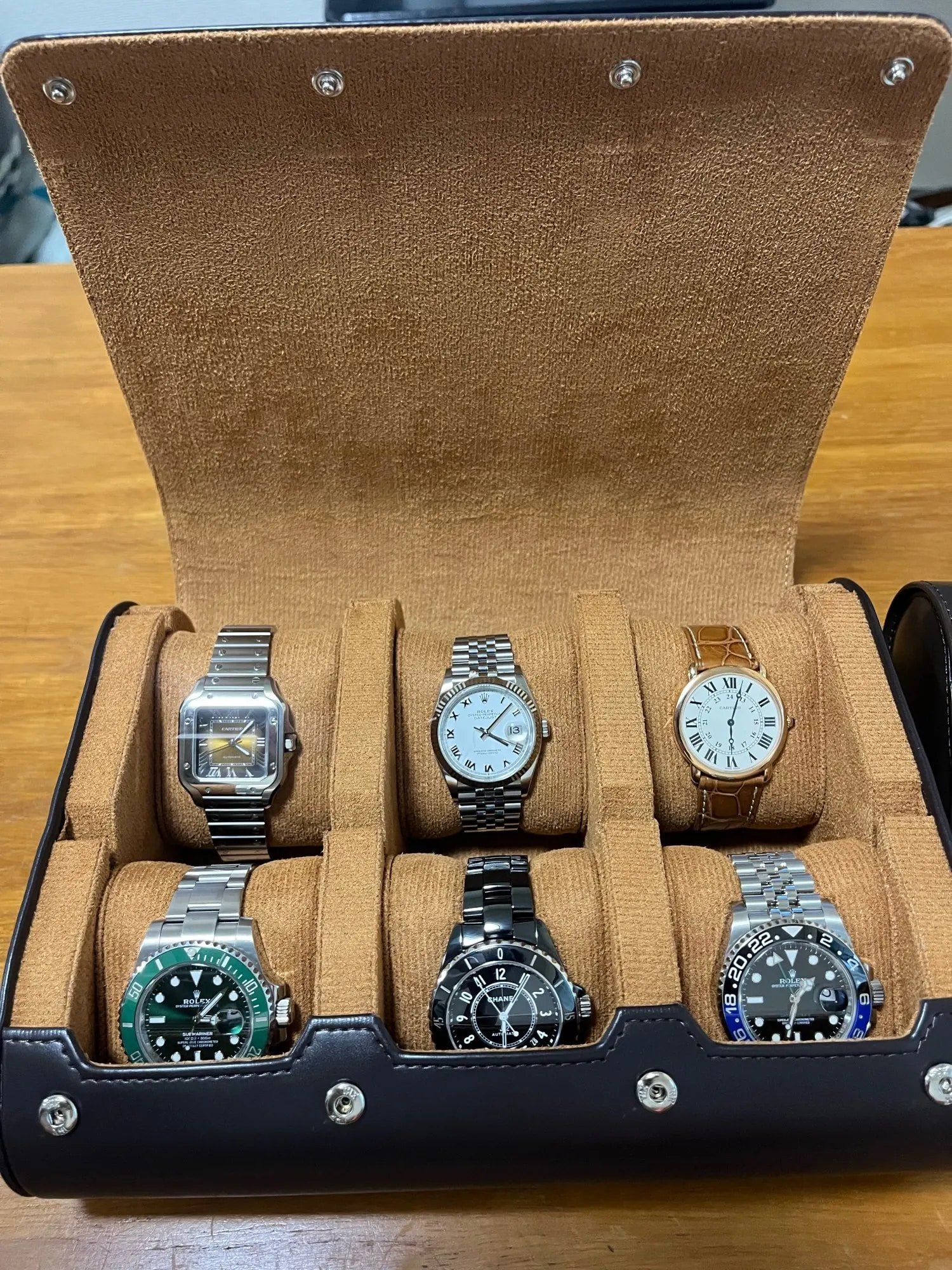 La coque rigide protège des chocs du quotidien, les coussins stables gardent chaque montre bien en place, et l’ouverture par boutons-pressions permet de prendre ou ranger sans frotter.