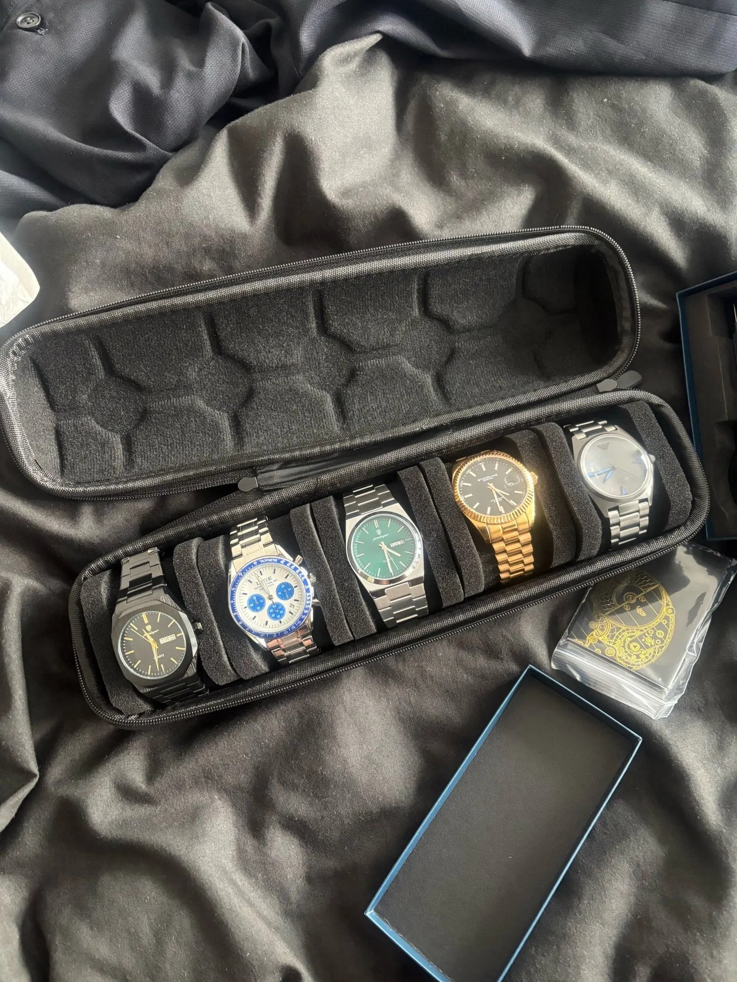 L’etui voyage montre peut accueillir 5 montres grâce à ses séparateurs intérieurs en mousse qui maintiennent chaque bracelet fermé. Les montres restent espacées, ne se touchent pas et ne bougent pas à l’intérieur.