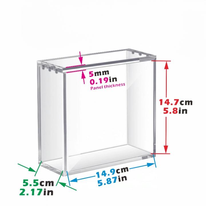 Dimensions intérieures utiles de 14.9×14.7×5.5cm avec des panneaux acryliques de 5mm d’épaisseur, la vitrine offre une structure stable et rigide. L’acrylique épais protège le contenu tout en gardant une transparence nette, idéale pour exposer un display scellé sans le déformer ni l’écraser.