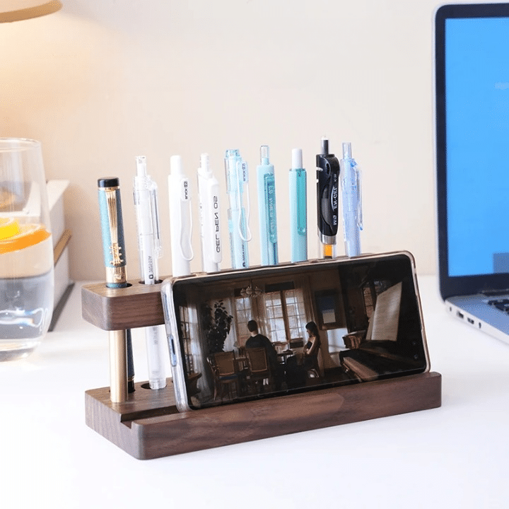 Ce porte stylo en bois combine ergonomie, polyvalence et qualité. Il met en avant vos plus beaux instruments d’écriture tout en gardant le bureau ordonné. La structure reste stable et agréable à utiliser au quotidien.
