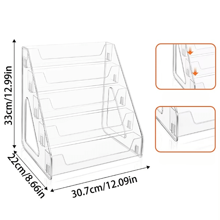 L’inclinaison verticale du présentoir assure un gain de place sur la surface plane tout en offrant un angle de vue optimal. Les dimensions totales de 30.7x22x33cm permettent d’installer le présentoir sur un bureau, une étagère ou dans une vitrine sans déséquilibre.
