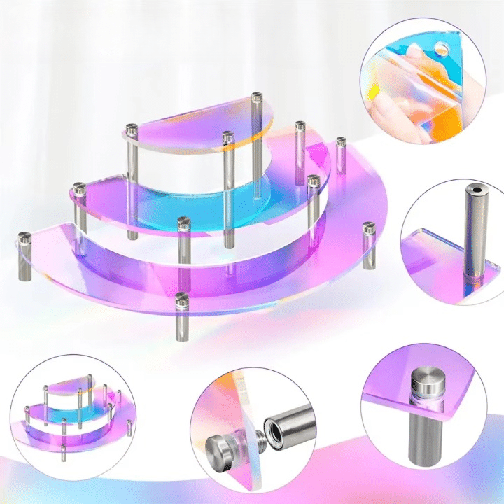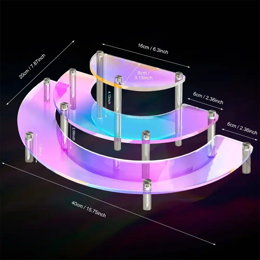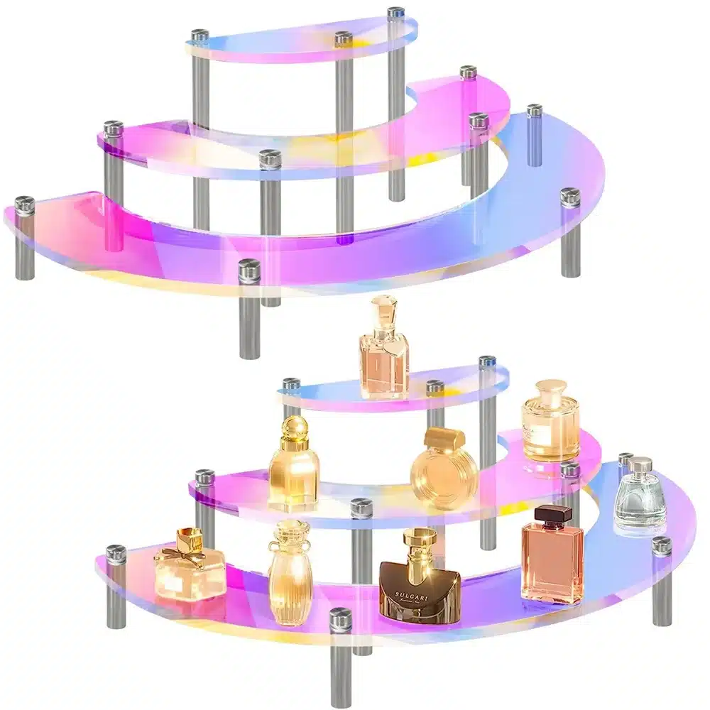 Présentoir en forme de demi-lune à 3 niveaux qui valorise vos flacons de parfum et optimise l’espace sur une table, une étagère ou un plan de toilette. Sa structure en acrylique transparent repose sur des pieds en acier solides pour assurer une stabilité durable.