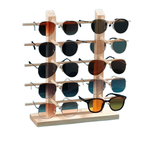 Présentoir en bois à assembler soi-même pour exposer de 4 à 10 paires de lunettes selon le modèle choisi.