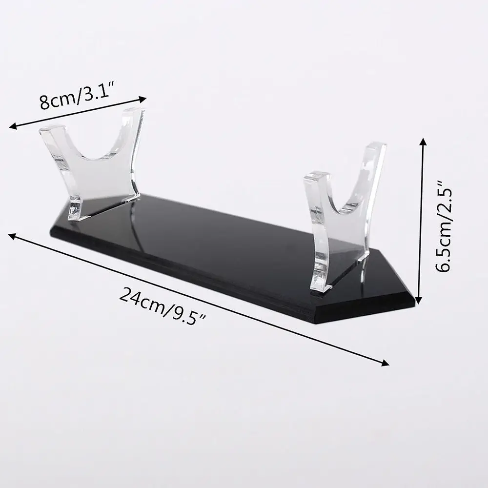 Le présentoir acrylique offre une surface brillante dont l’effet miroir reflète l’objet et renforce le contraste des couleurs. Base noire pour ancrer l’ensemble et supports transparents à chaque extrémité pour garder l’attention sur la réplique.