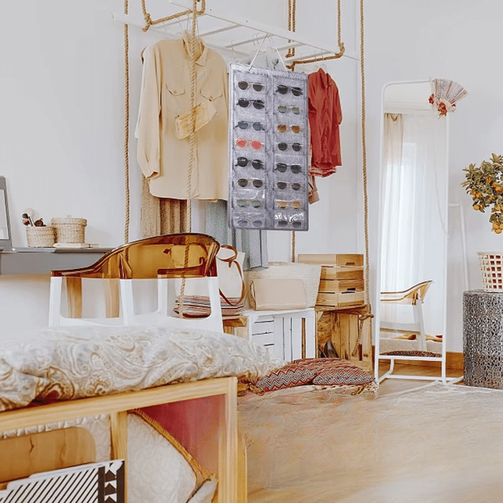 Le range lunettes mural remplace la boîte à fouillis par un affichage lisible qui met en avant couleurs et styles.