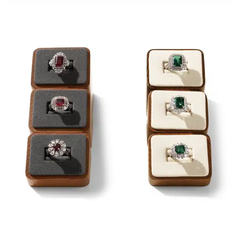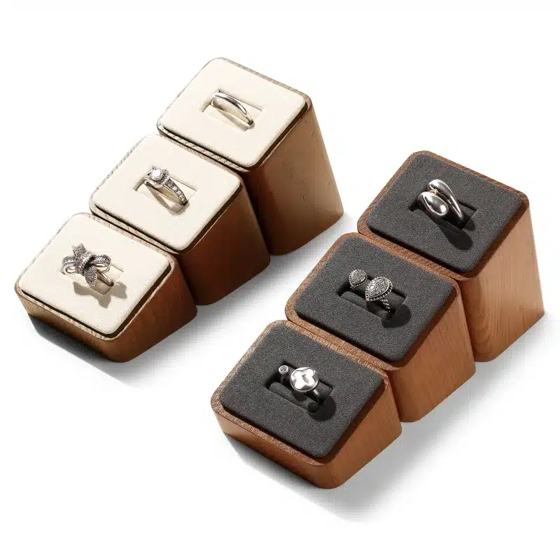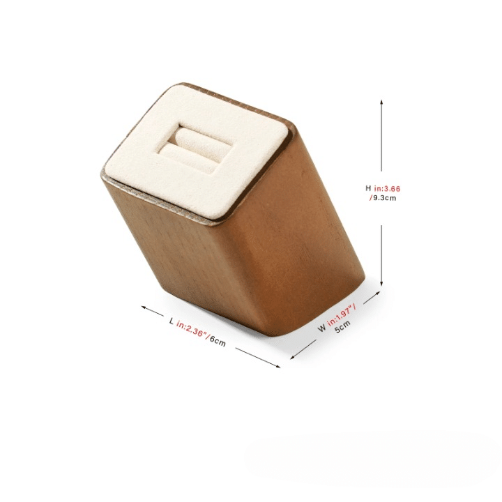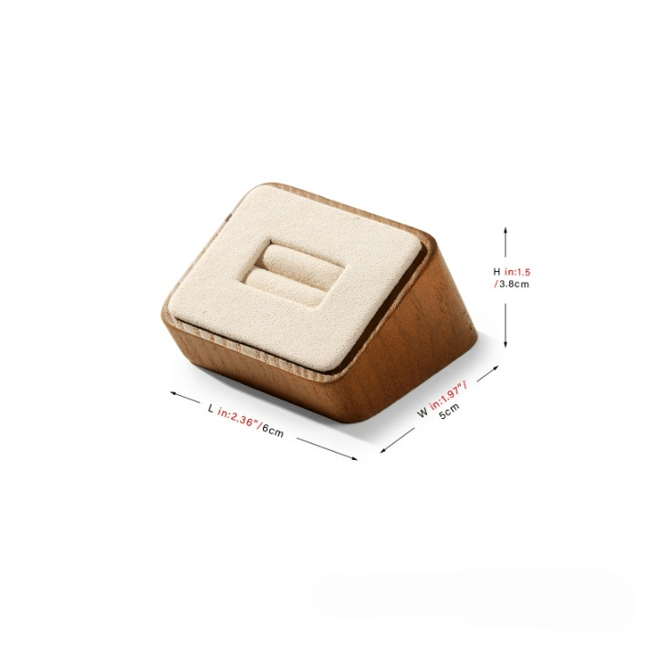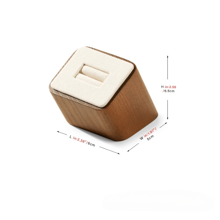 Le duo bois naturel + tissu microfibre offre un aspect visuel contemporain avec des matières nobles qui valorisent chaque détail. Le support bague fonctionne aussi bien en vitrine qu’en séance shooting photo, pour créer un rendu propre sans éléments parasites.