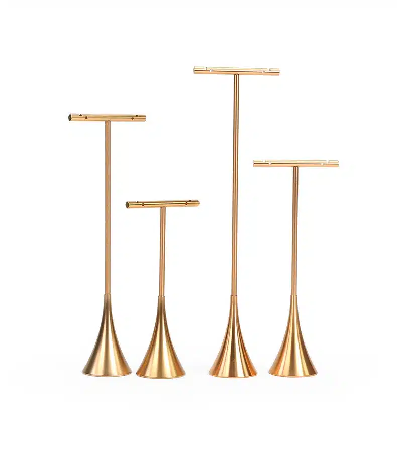 Chaque modèle est doté d’une base en forme de tulipe de 3.5cm, assurant une bonne stabilité sur tout type de surface. Les 4 hauteurs différentes de 12cm, 15cm, 18cm et 21.5cm créent un effet visuel équilibré et permettent d’exposer plusieurs tailles de boucles à la fois.