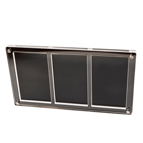 Support acrylique horizontal et transparent à fond noir avec 3 emplacements verticaux pour cartes gradées PSA, ce support carte gradée met en avant vos cartes comme dans une petite vitrine de collection. La base noire crée un contraste fort avec les boîtiers, ce qui rend les cartes plus visibles sur un meuble ou une étagère.
