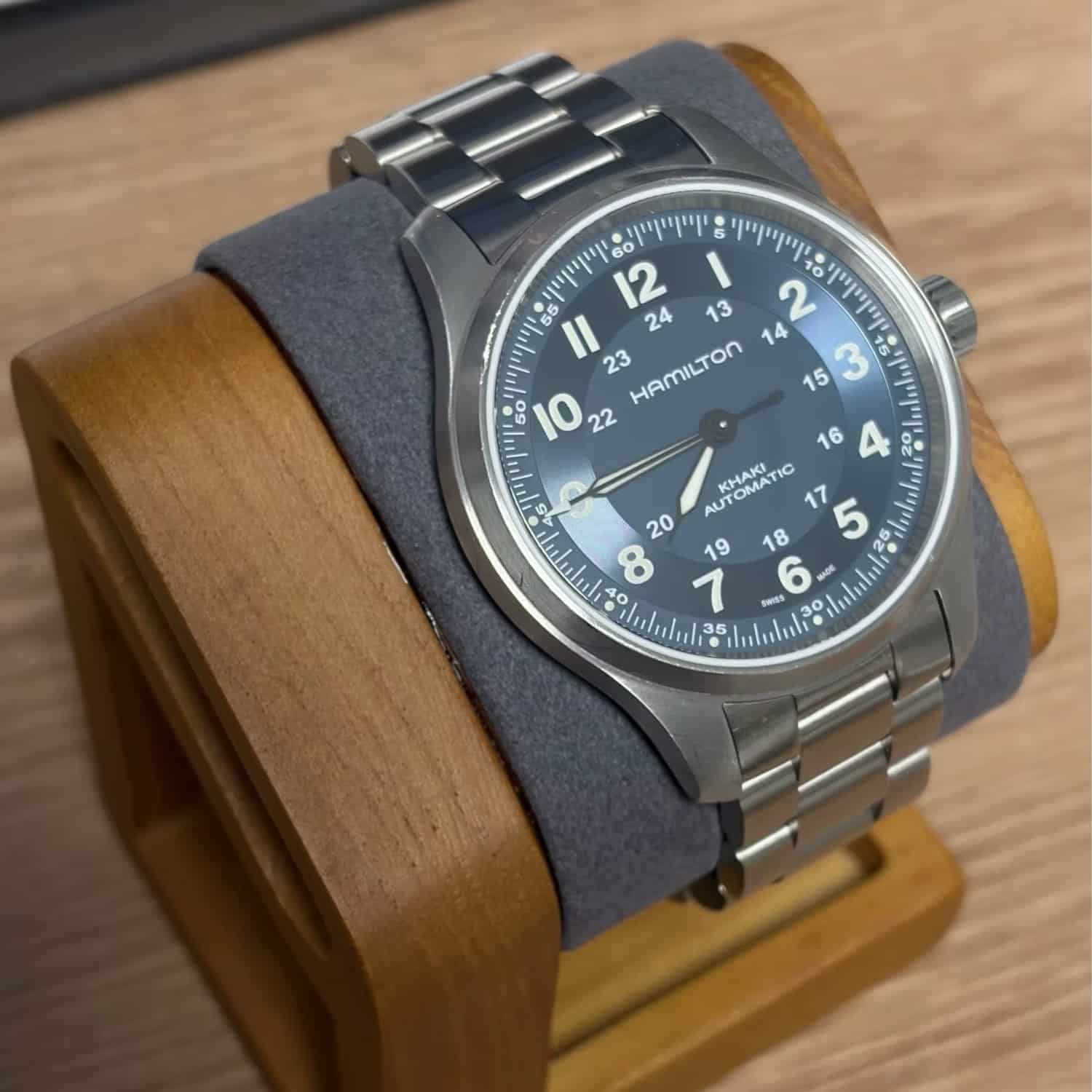 Le support en bois massif et velours met la montre au premier plan et protège le bracelet sans le marquer.