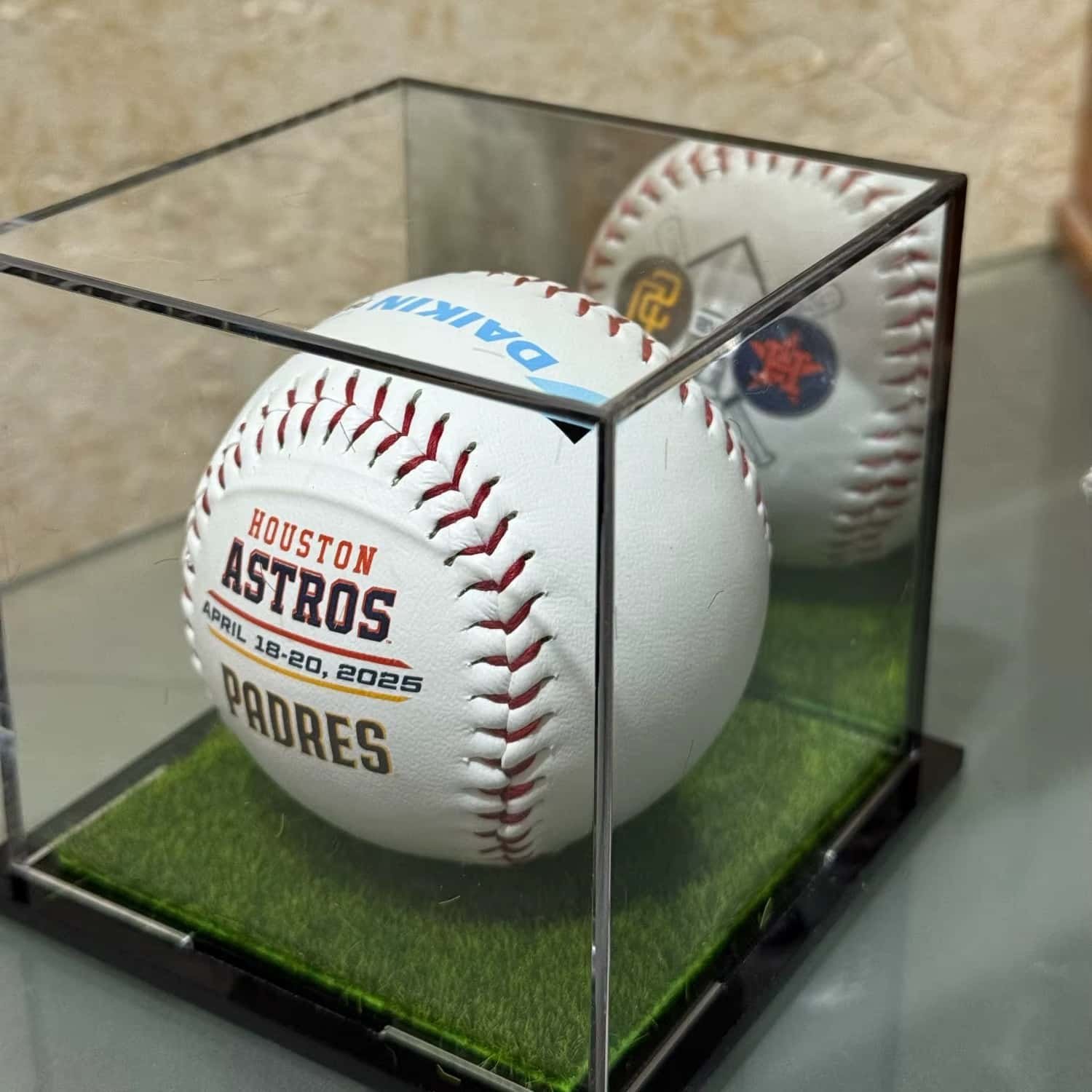 À la base, un gazon synthétique vert recouvre la surface plane intérieure et donne un rendu proche d’un vrai terrain. La balle repose sur un anneau acrylique transparent qui la maintient au centre de la vitrine et évite les marques sur la surface.