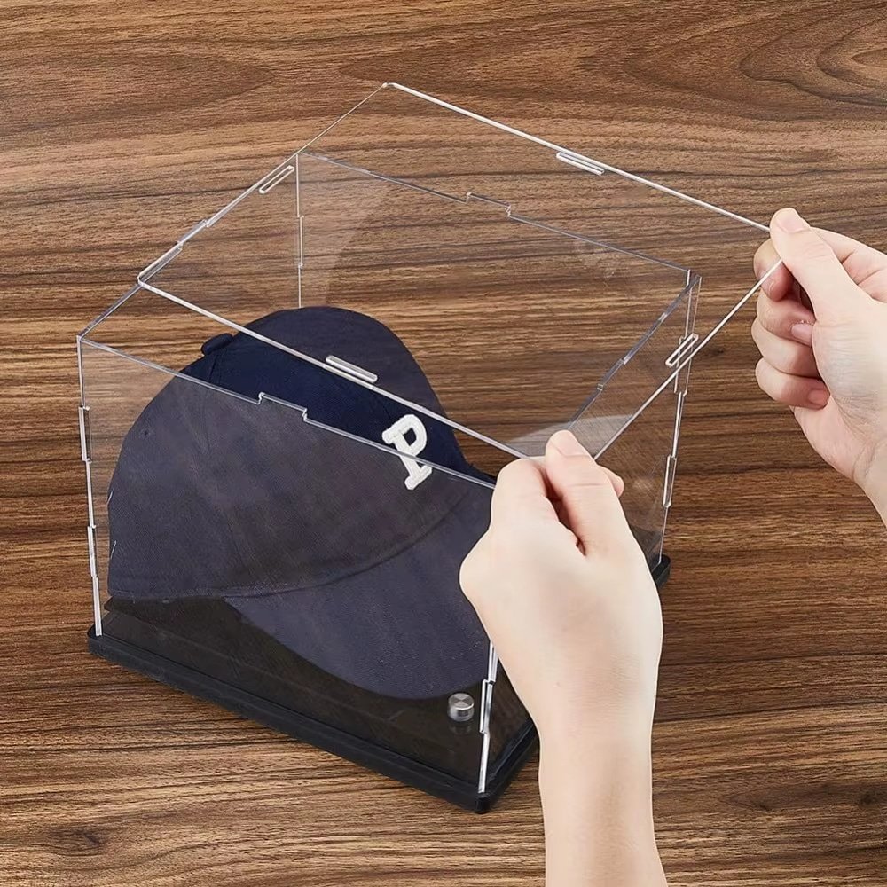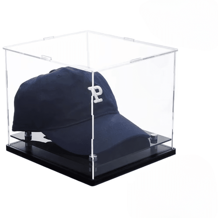 Ses dimensions de 21.8x20x17.5cm sont pensées pour présenter une casquette sans l’écraser et sans perdre de place. La base noire en acrylique donne un contraste net, et le plateau support intérieur repose sur 4 mini pieds métalliques : l’objet est surélevé, mieux visible, et ça fait tout de suite plus “collection”.