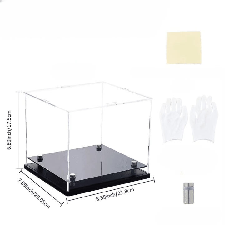 Les panneaux latéraux et le panneau supérieur sont en acrylique transparent pour garder une vue claire sur tous les angles. Un film protecteur est présent pour éviter les marques pendant le transport : à retirer avant usage pour profiter d’une transparence nette. Pour un montage sans stress, le kit inclut une paire de gants blancs anti-traces et une lingette anti-poussière, pratique pour garder la vitrine propre dès le départ.