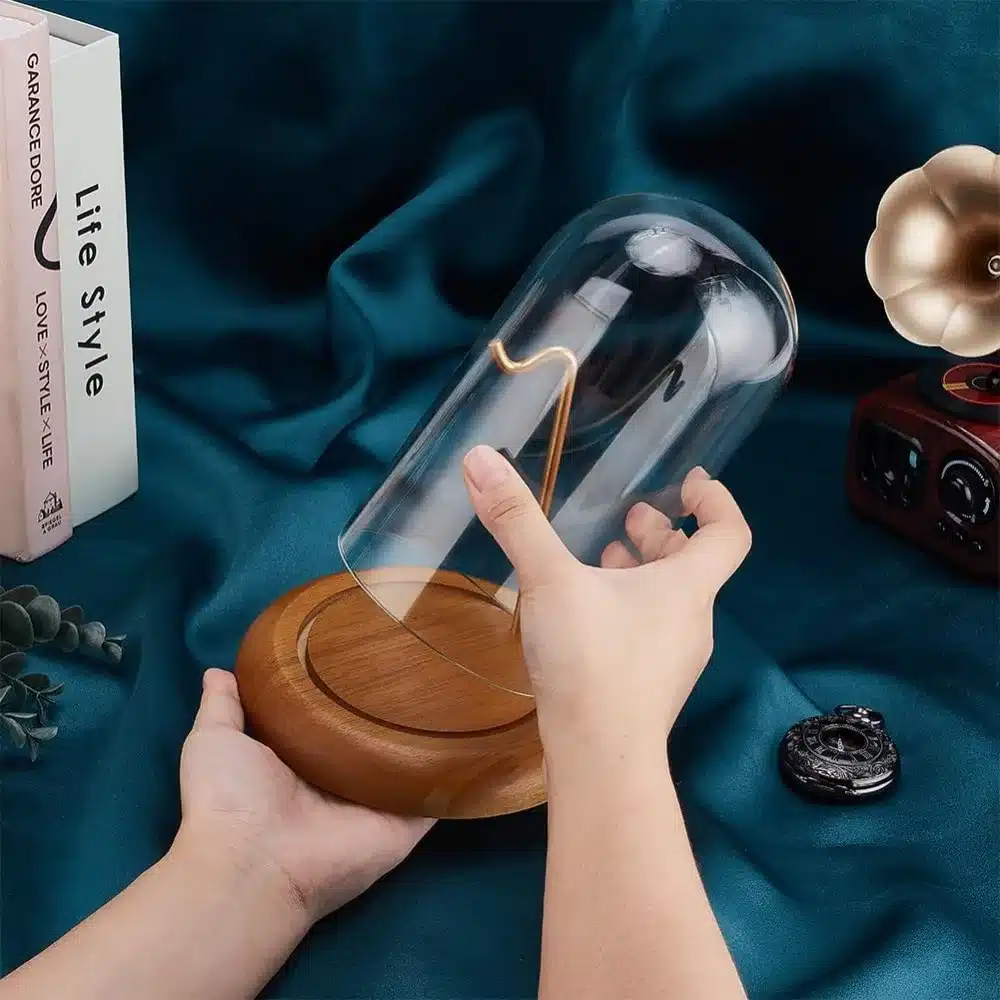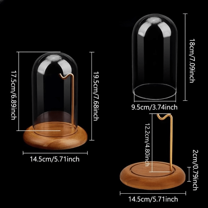 Cloche en verre transparent qui protège vos bijoux tout en les mettant en valeur dans un écrin élégant. La base en bois massif de 14.5cm de diamètre offre une stabilité parfaite et accueille la cloche grâce à une rainure discrète qui la maintient bien en place.