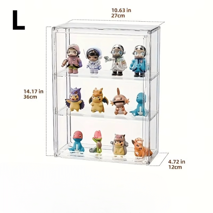 Deux modèles au choix pour adapter l’espace à chaque collection : le modèle M 27×22×12cm intègre 1 étagère intérieure amovible pour créer deux niveaux, le modèle L 36×27×12cm propose 2 étagères intérieures amovibles pour organiser jusqu’à trois niveaux. Vous ajustez la hauteur selon la taille des figurines.