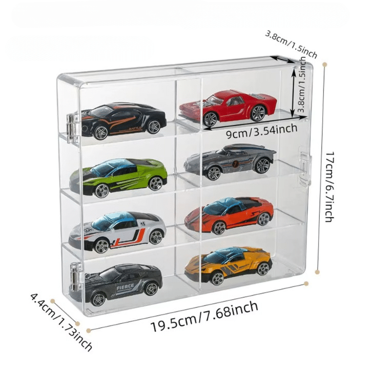 8 compartiments par vitrine pour classer vos modèles réduits ; chaque case mesure 9×3.8×3.8cm et accueille la plupart des formats 1:64 (Majorette, Hot Wheels, Matchbox).