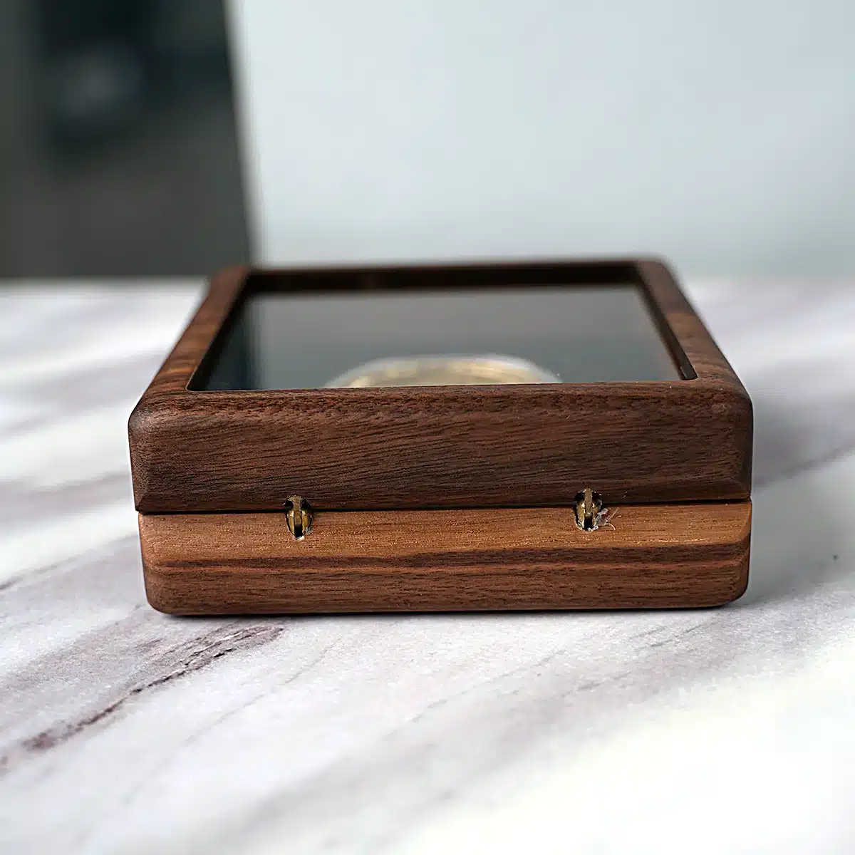 Le panneau supérieur combine un cadre en bois et une fenêtre acrylique claire pour une lecture nette de la gravure et des détails. La fermeture se fait par mini aimants néodyme qui maintiennent le couvercle sans jeu. Des mini charnières discrètes assurent une ouverture fluide sans encombrer la vue.